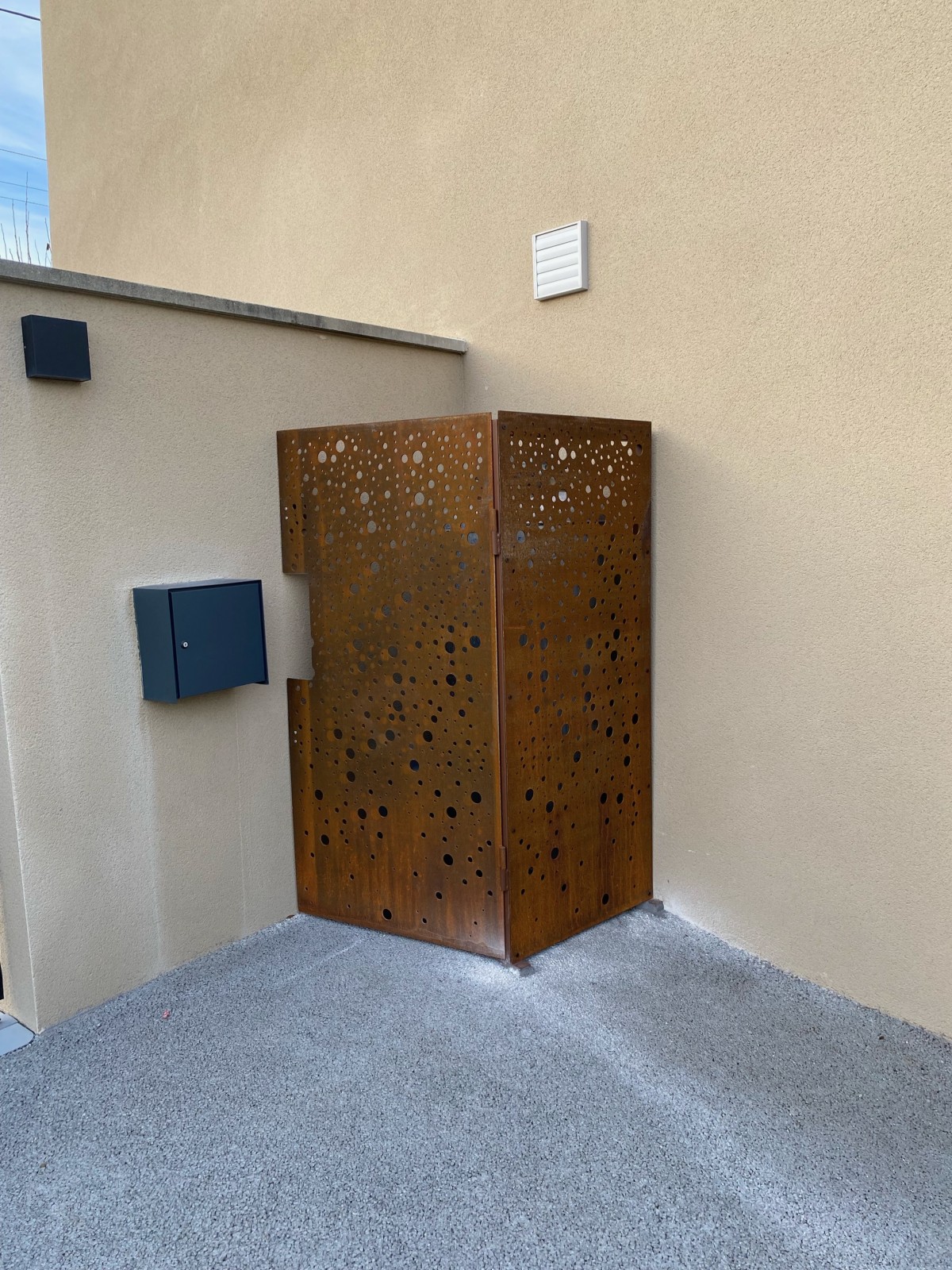 Voici la fabrication d’un châssis fixe avec portillon en acier Corten destiné à dissimuler deux bouteilles de gaz installées en extérieur. Le projet a débuté par la découpe précise des tôles et profils afin de constituer une structure solide, résistante aux intempéries et parfaitement adaptée aux dimensions des bouteilles. Les éléments ont été assemblés puis soudés avec soin pour garantir une fermeture fiable et un alignement impeccable du portillon. Après le meulage et la préparation des surfaces, l’ensemble a reçu une peinture au four, assurant une protection durable tout en mettant en valeur l’aspect caractéristique du Corten. Le résultat est un habillage fonctionnel, esthétique et parfaitement intégré à l’environnement.